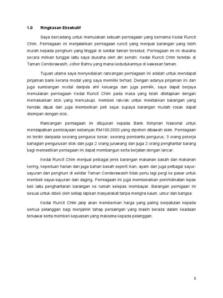 Chavez Clayton said. 36 KEUSAHAWANAN BUKU KERJA RANCANGAN PERNIAGAAN PROFIL SYARIKAT CONTOH RINGKASAN EKSEKUTIF RINGKASAN EKSEKUTIF Rancangan Perniagaan ini disediakan adalah bagi mendapatkan pembiayaan kewangan dari agensi pembiayabank di bawah nama Skim Pembiayaan bagi projek Kedai Dobi saya iaitu nama perniagaan di lokasi. Home current Explore Explore All.